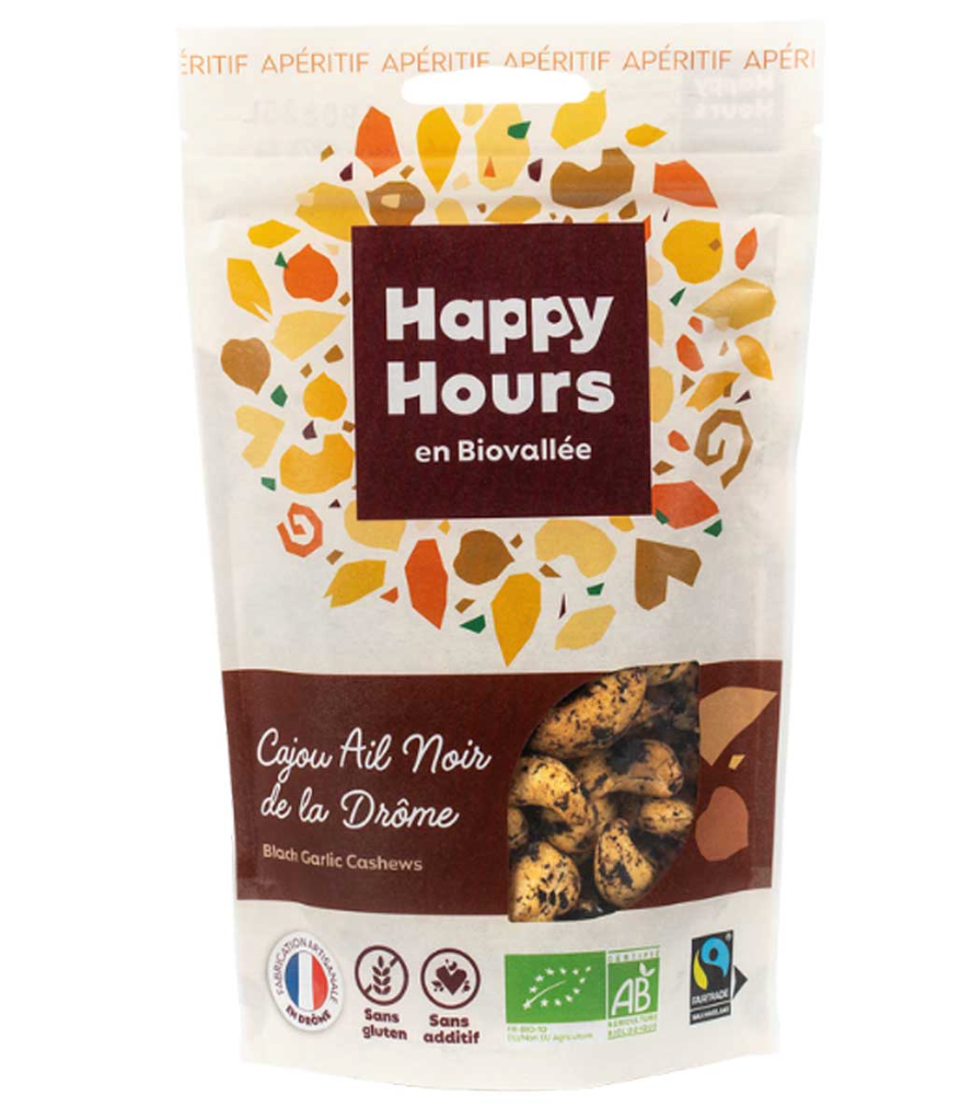 Le sachet de cajou ail noir bio de la Drôme Happy Hours en Biovallée propose une alliance gourmande et originale, parfaite pour un encas sain et savoureux. Le sachet contient 115 g.BIO
