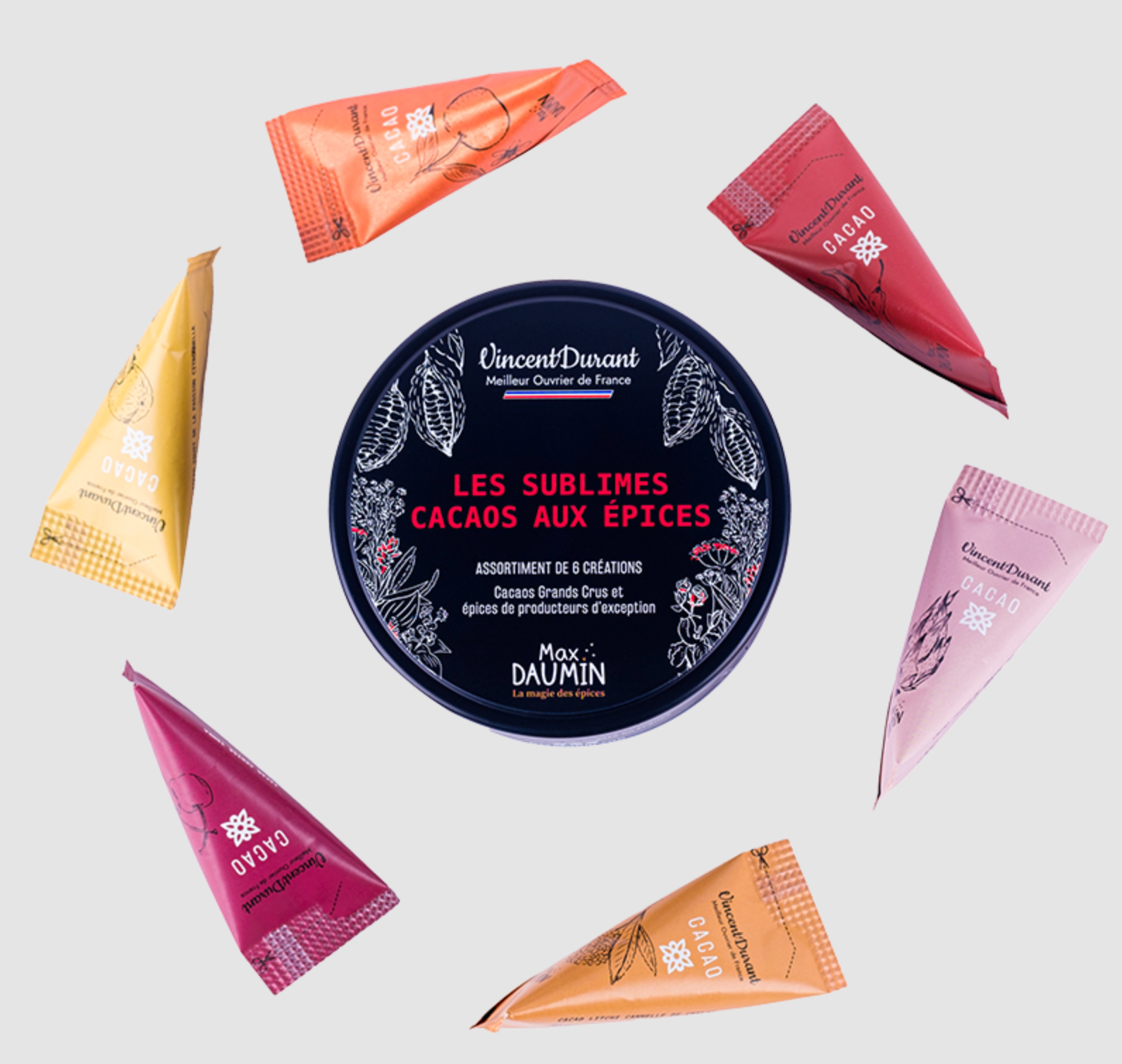Vincent Durant, Meilleur Ouvrier de France Chocolatier et Max Daumin se sont associés culinairement pour vous proposer 6 créations uniques de cacaos grands crus aux épices en berlingot. C'est la rencontre de deux savoir-faire de l'Ain.