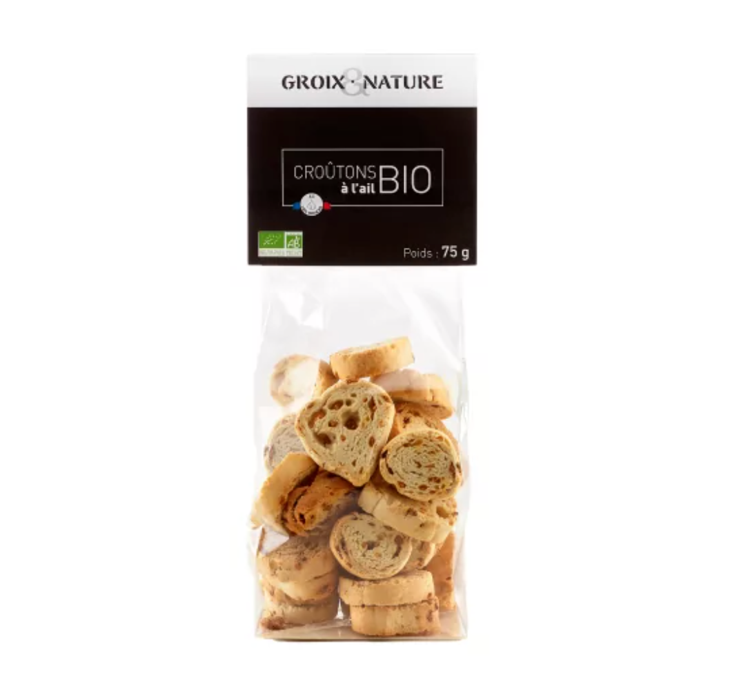 Découvrez les croûtons à l’ail BIO, confectionnés par la dernière biscotterie artisanale de France à partir de blé 100% français, sans colorant ni conservateur.