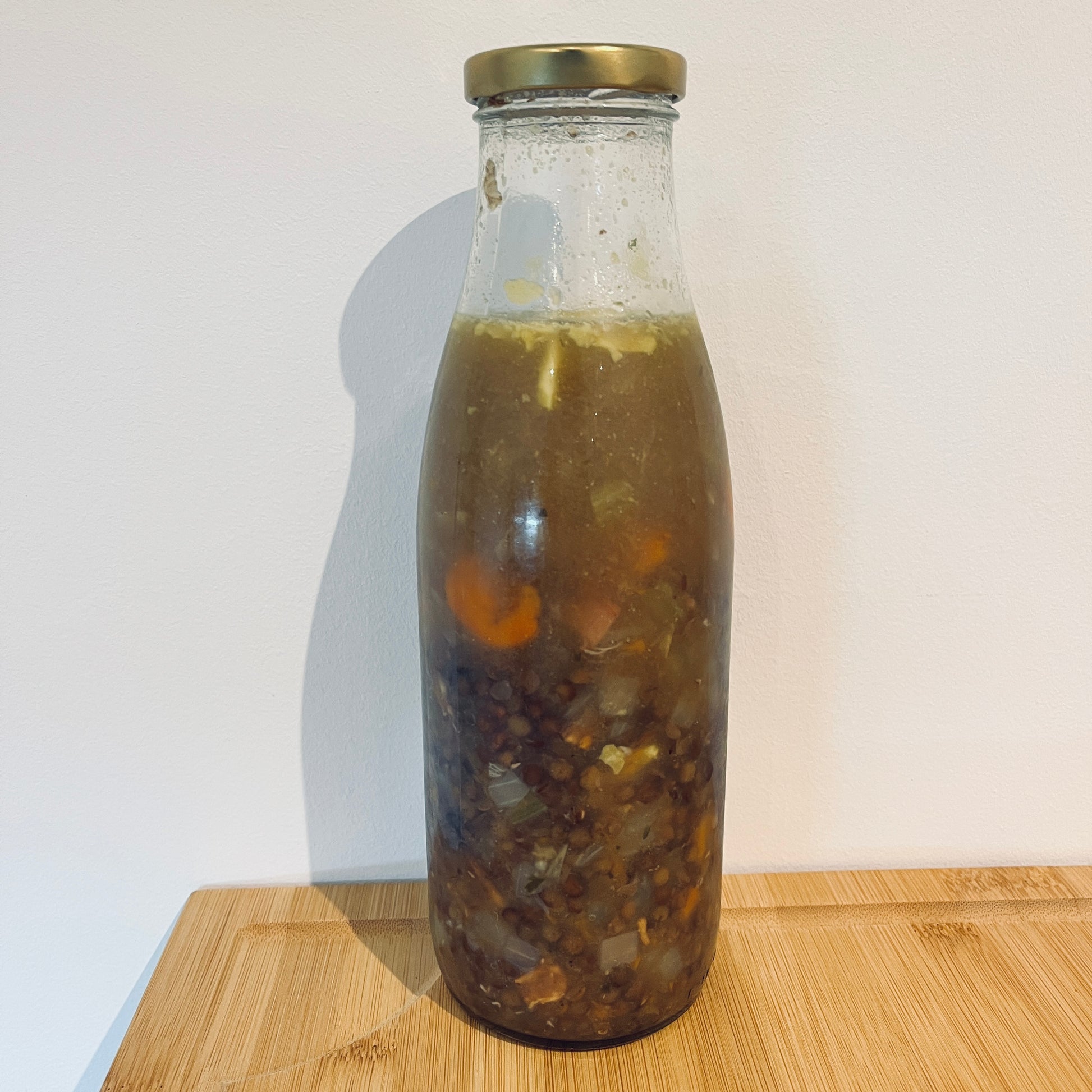 Soupe de lentilles et bacon, mijotée avec de petits légumes fondants :